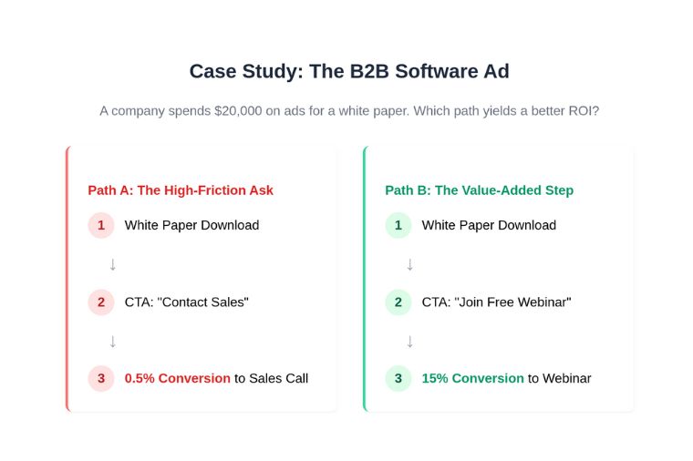 Take, for instance, a B2B software company that spends $20,000 a month on LinkedIn ads advertising their white paper. In one version, the thank-you page says simply, “Contact Sales.” Conversion to a sales call is merely half a percent. In another version, the CTA invites users to an associated webinar. Fifteen percent sign up. Later when they ask for a discussion with sales, more feel prepared to. The difference is clear.
